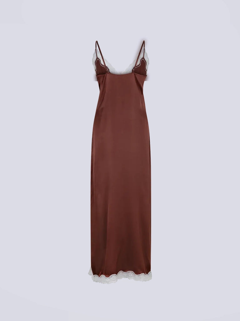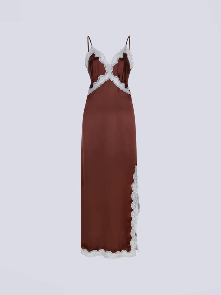 This silk maxi dress in a lingerie style by Mist Love Stories features thin, adjustable straps and a deep V-neckline. It's trimmed and finished with delicate blue lace. It features a slit at the hem and is ankle-length. Perfect with heeled sandals.