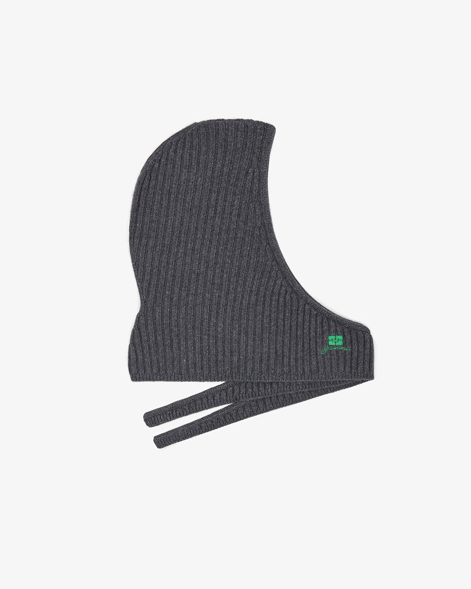 Szara, prążkowana balaclava 6925 Charcoal Grey marki GANNI z wyhaftowanym logo marki. Zaprojektowana tak, aby nosić ją jako kaptur, a dodatkowe szaliki owinąć wokół szyi. Wykonana z dzianiny z wełną.