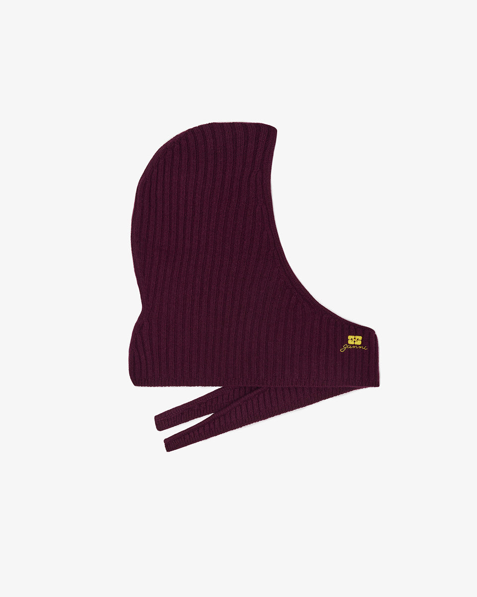 Burgundowa, prążkowana balaclava 6927 Burgundy marki GANNI z wyhaftowanym logo marki. Zaprojektowana tak, aby nosić ją jako kaptur, a dodatkowe szaliki owinąć wokół szyi. Wykonana z dzianiny z wełną.