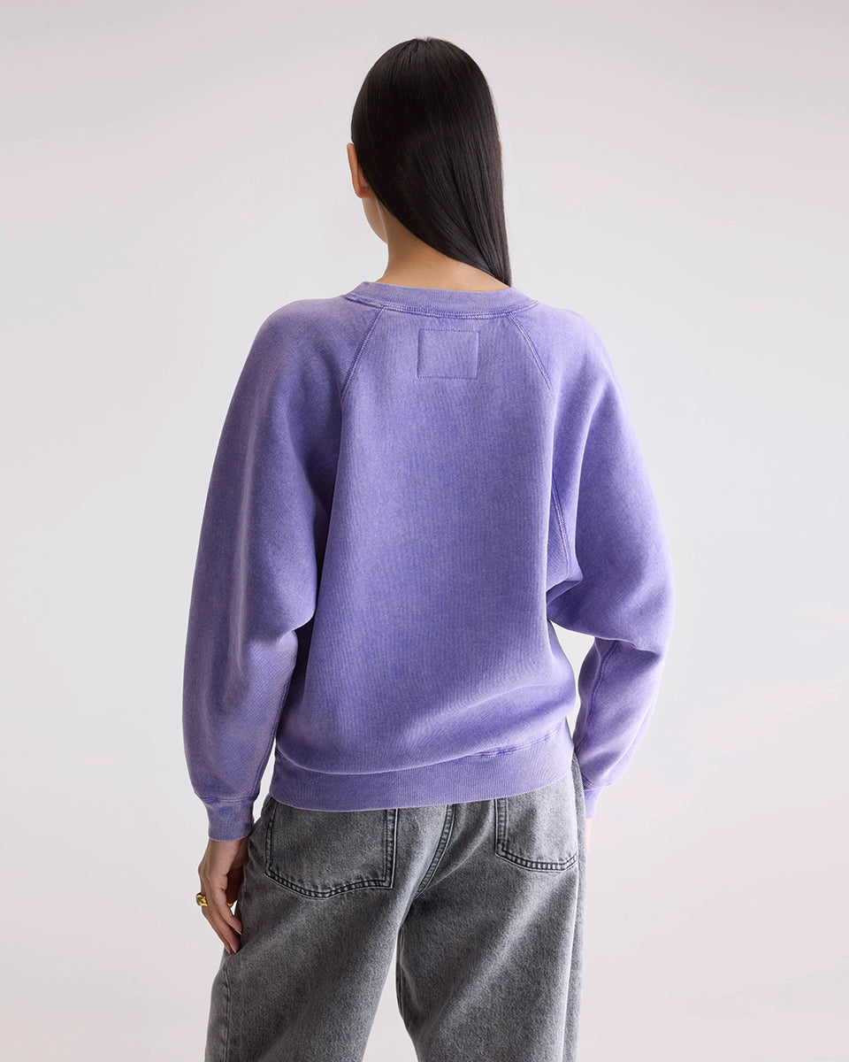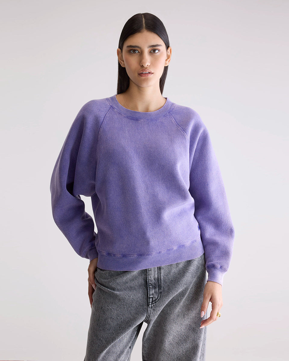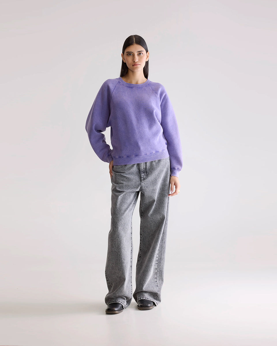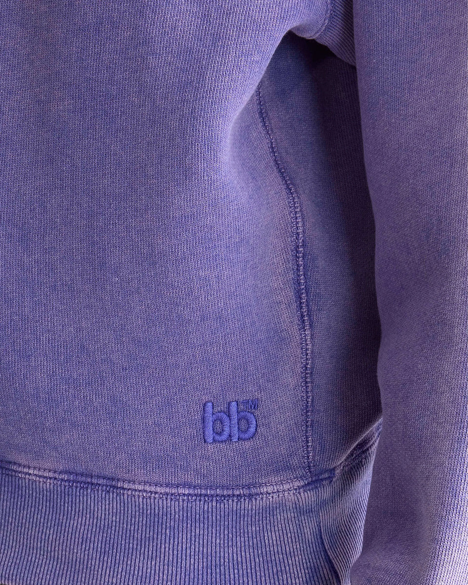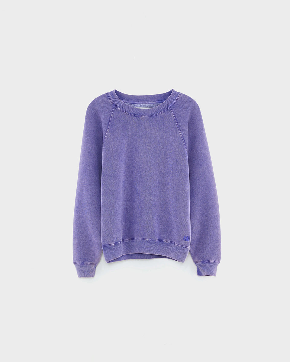 Luźna, fioletowa bluza Fella Bellerose z okrągłym dekoltem i opadającymi rękawami. Wykończona ściągaczami. U dołu posiada niewielkie, haftowane logo marki. Wykonana z miękkiej tkaniny z bawełną z kolorystycznym efektem delikatnego "sprania".