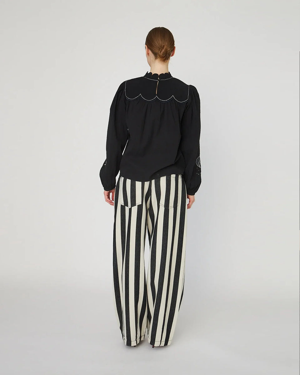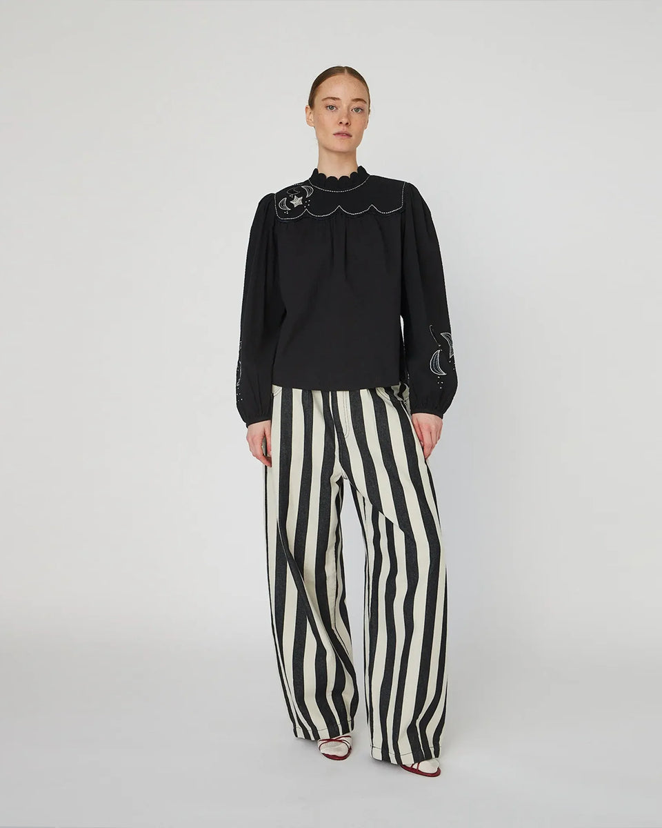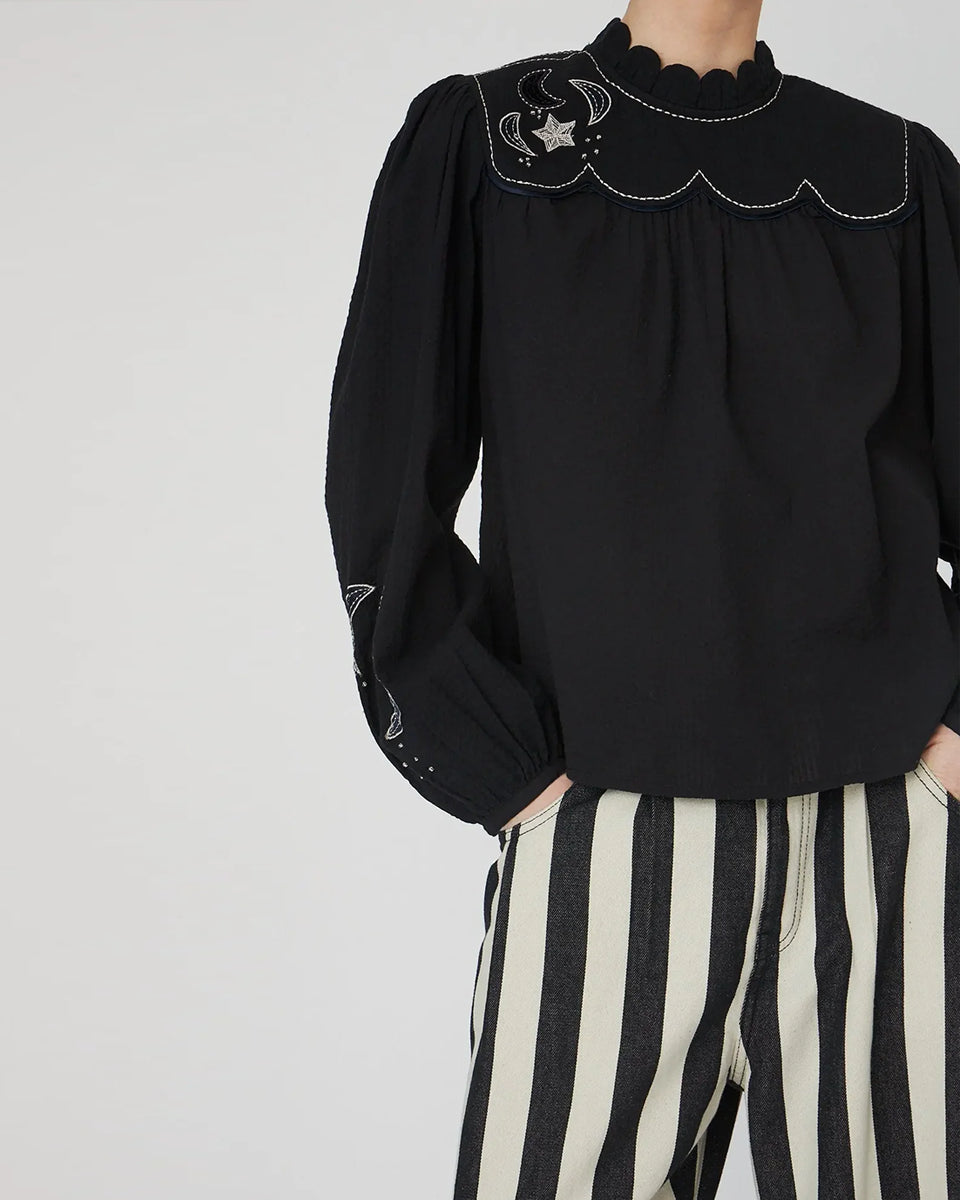 Bawełniana bluzka Embroidered Moon&Star marki STELLA NOVA z muszelkowym kołnierzykiem pod szyję i długimi rękawami. Zdobiona haftowanymi motywami gwiazd i księżyca. Rękawy wykończone są mankietami z rozcięciem zapinanym na guzik oraz marszczeniami u góry, które nadają im bufiastego charakteru. Z tyłu znajduje się rozcięcie z guzikiem i pętelką do zapięcia. Wykonana z bawełny organicznej.