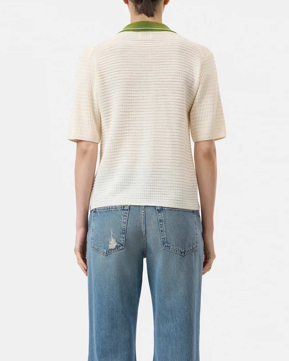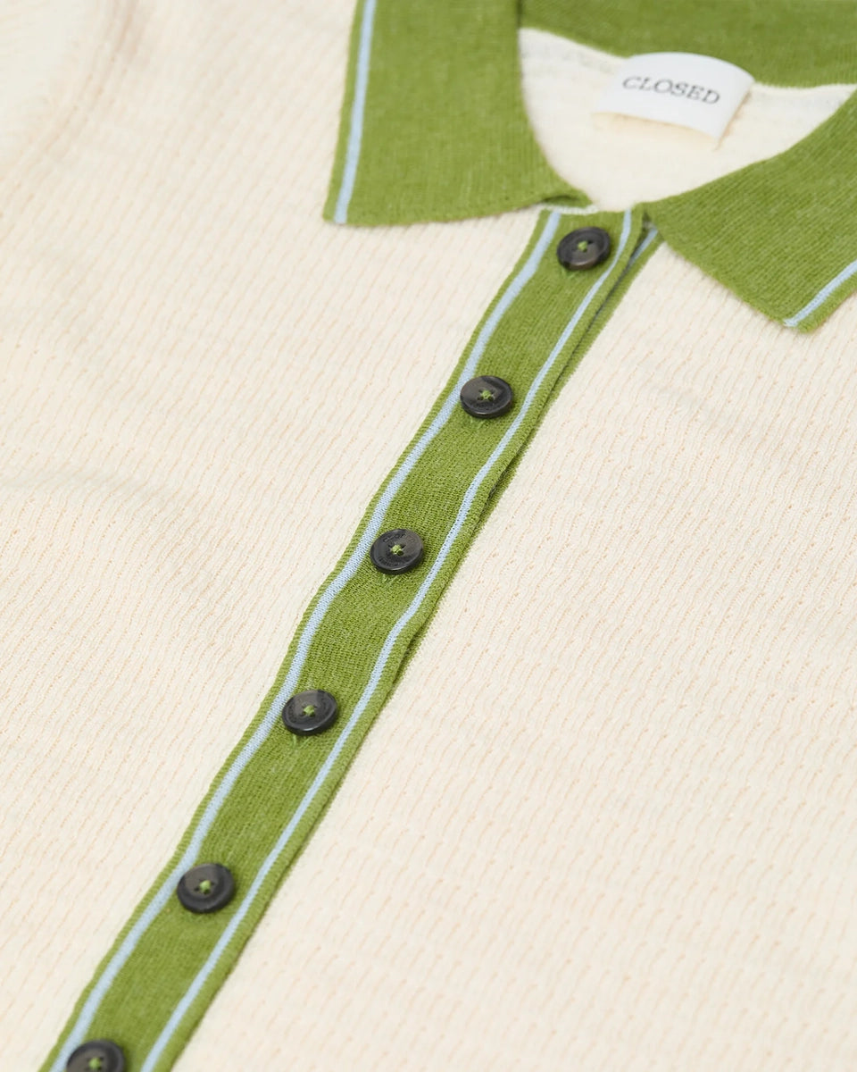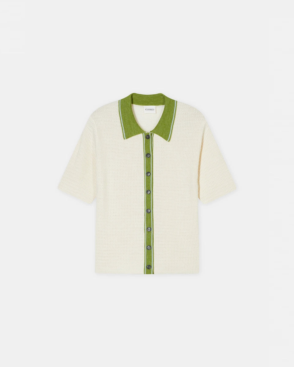 Luźna, dzianinowa bluzka Polo CLOSED z krótkim rękawem o długości do łokcia. Posiada kontrastowy kołnierzyk i obszycie przy zapięciu na guziki. Bluzka ma prosty krój.