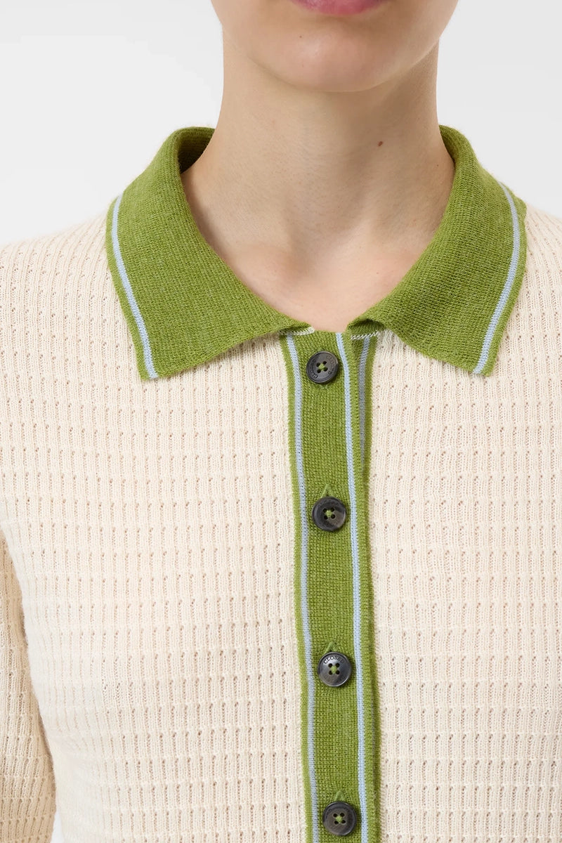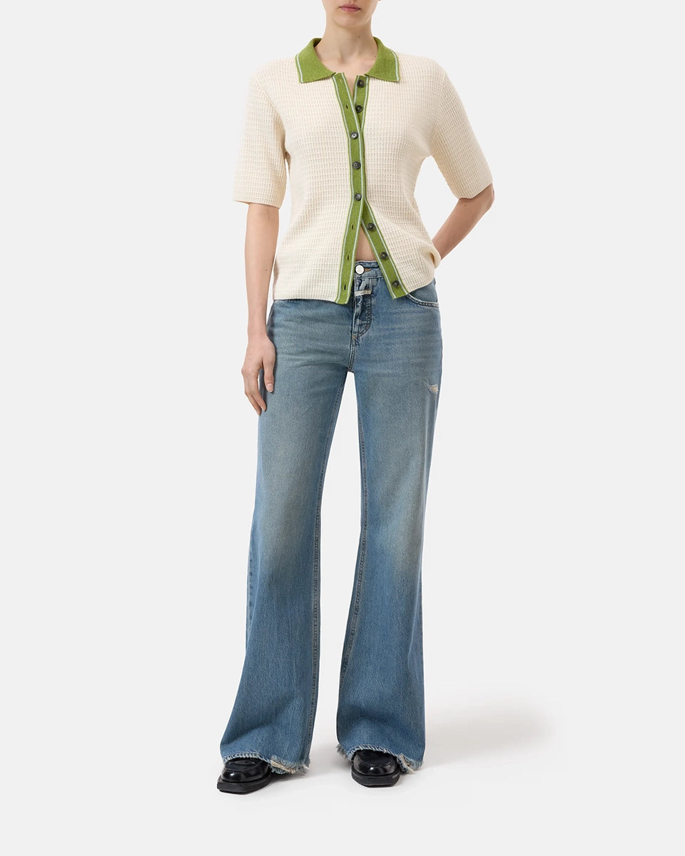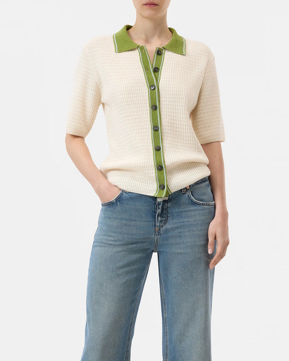 Luźna, dzianinowa bluzka Polo CLOSED z krótkim rękawem o długości do łokcia. Posiada kontrastowy kołnierzyk i obszycie przy zapięciu na guziki. Bluzka ma prosty krój.