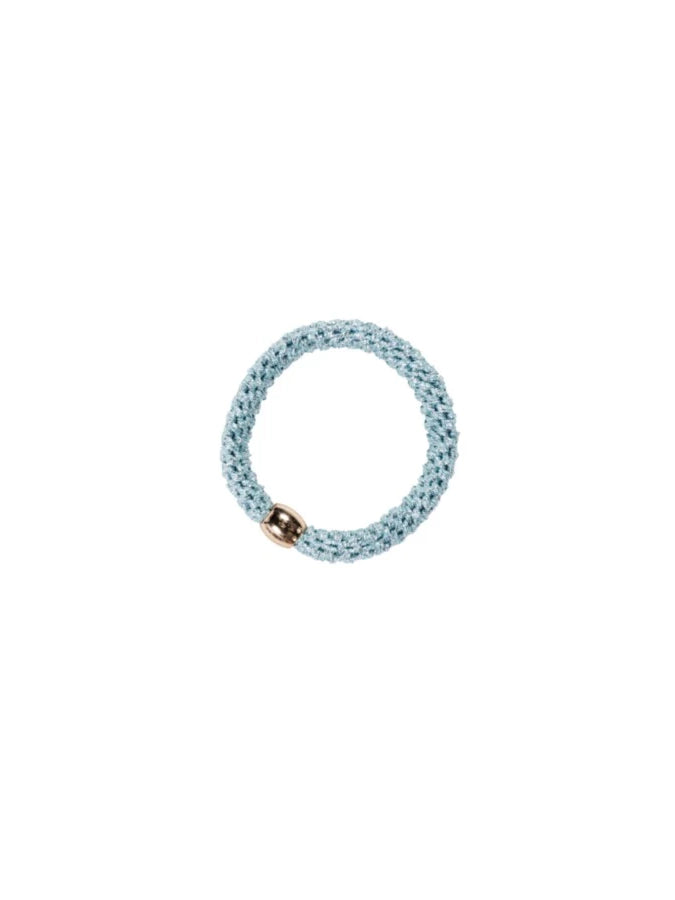 Niewielka, pleciona guma do włosów ze złotym, mosiężnym koralikiem.