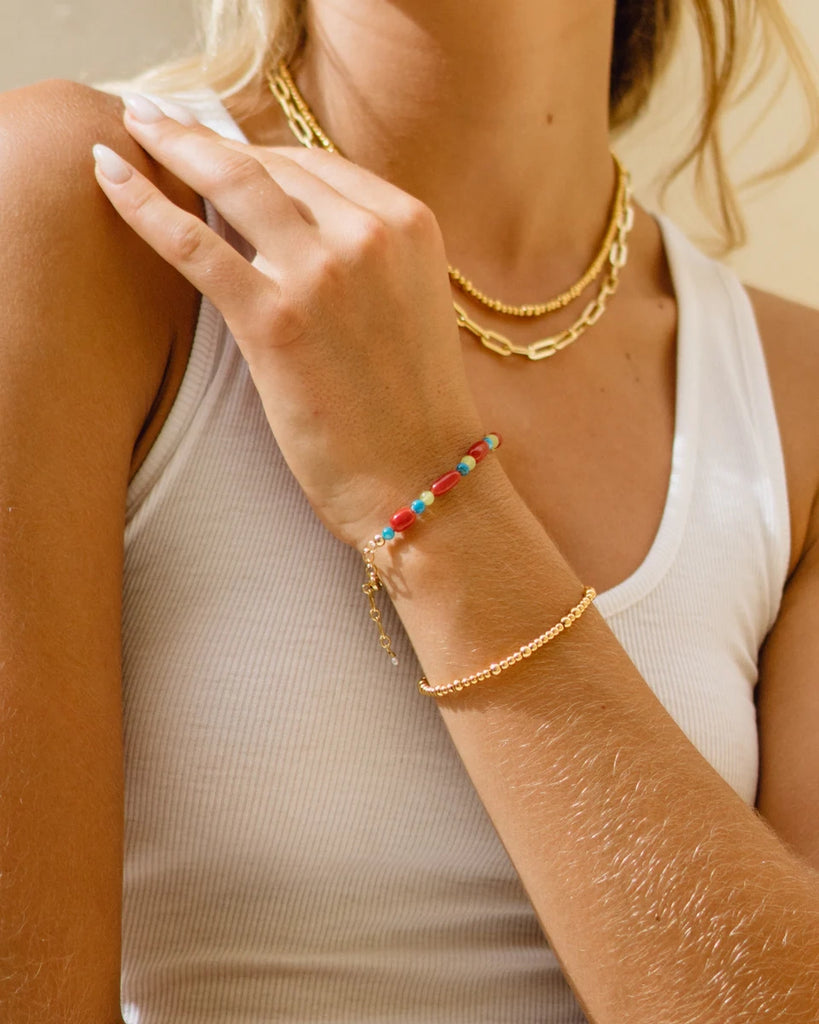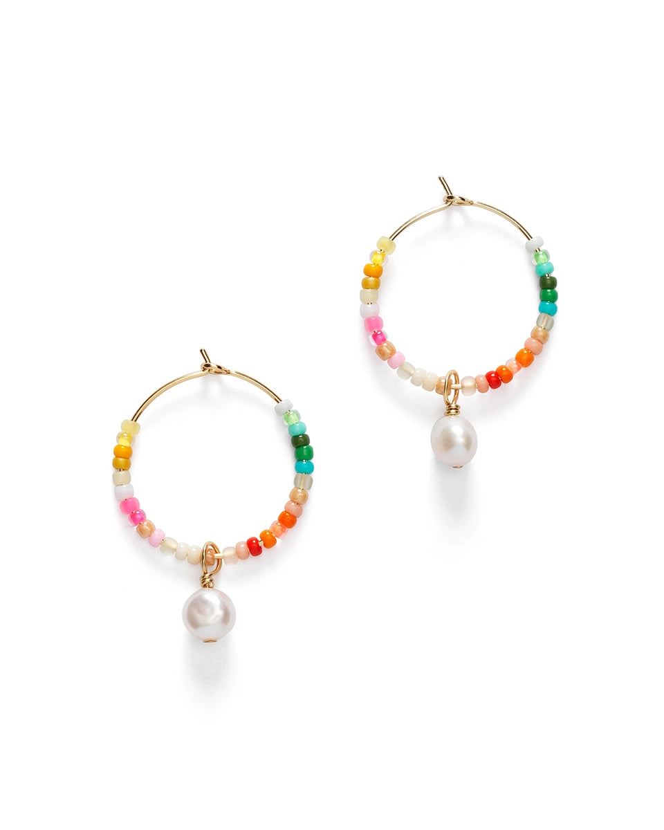 Cienkie, okrągłe kolczyki Rainbow Nomad Anni Lu z kolorowymi, tęczowymi koralikami i zwisającymi naturalnymi perłami.