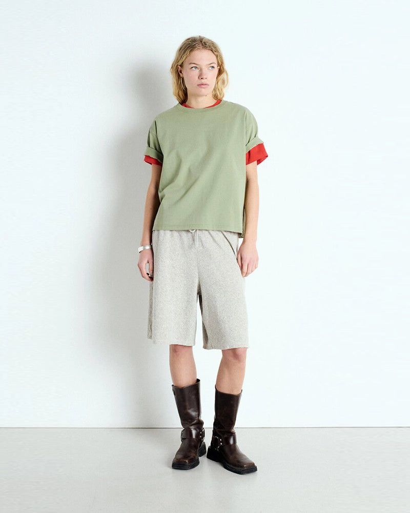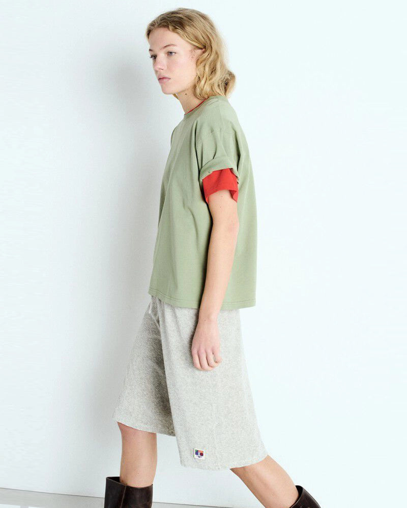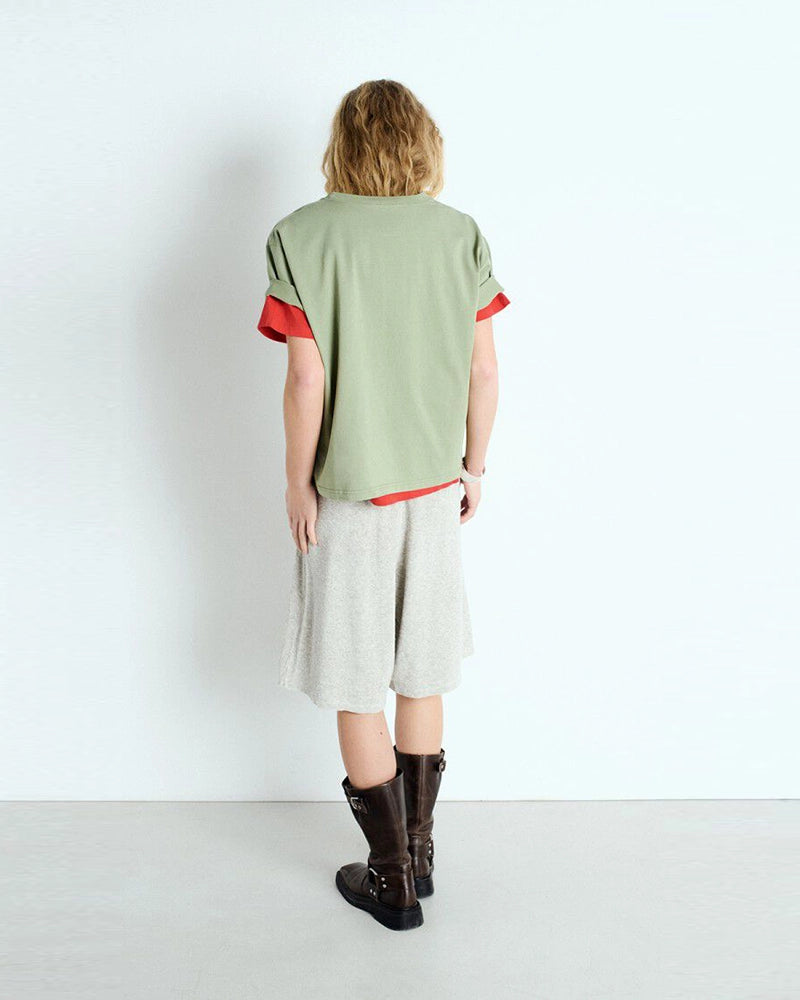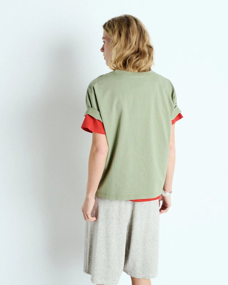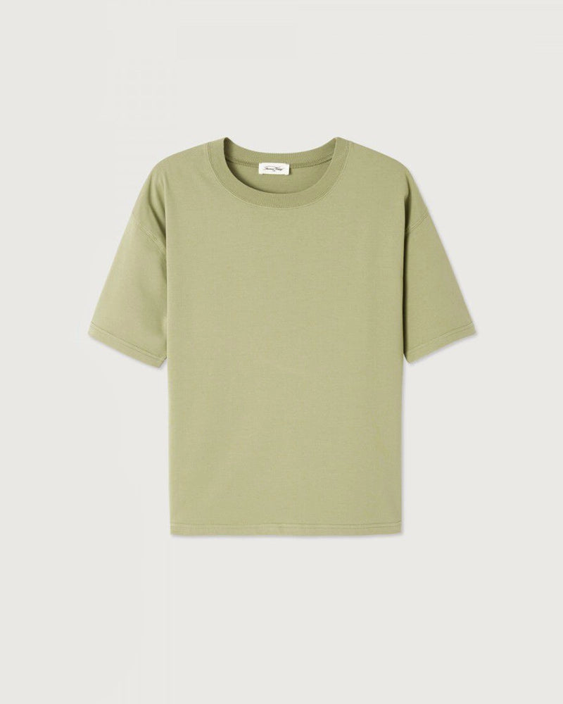 Luźny, oversizowy, prosty t-shirt FIZVALLEY American Vintage z krótkim, szerokim rękawem i okrągłym dekoltem. Wykonany z grubej, mięsistej bawełny.